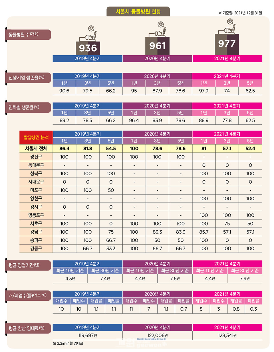 ‘서울시 우리마을가게 상권 분석 서비스’ 데이터를 통해 서울시 2021년 12월 31일 4분기와 2020년 4분기, 2019년 4분기를 비교한 결과, 동물병원 수는 지난해 말 4분기 현재 977명으로 2년 전인 2019년 4분기(936개소) 대비 41개소(4.38%) 증가했다.