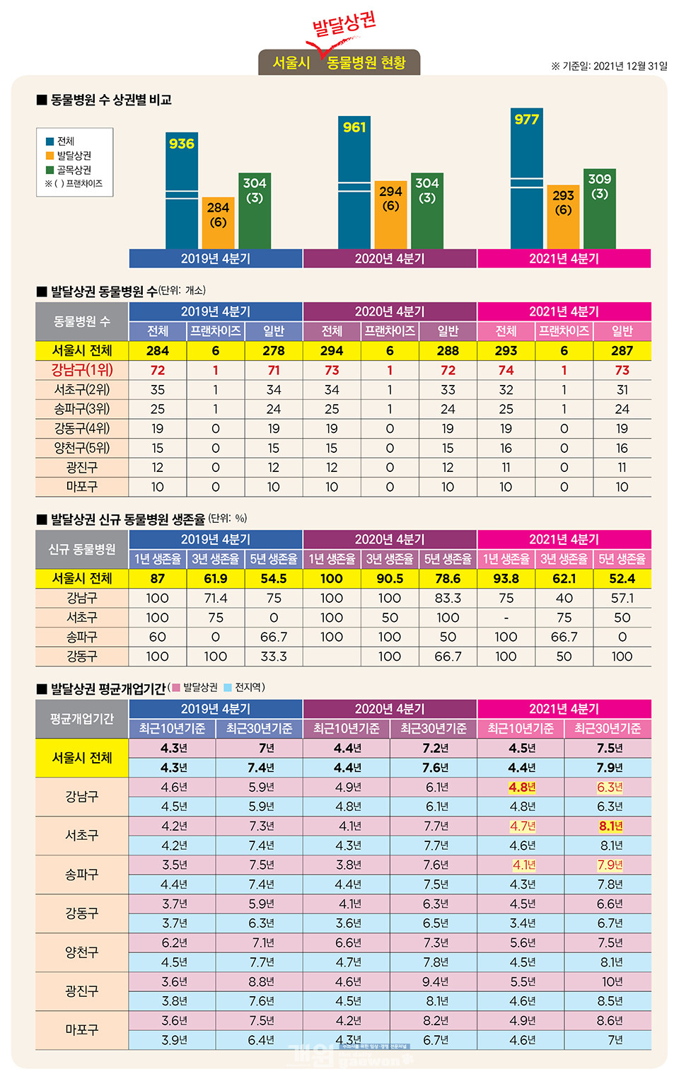 강남 3구는 2021년 4분기 최근 10년 기준 평균개업기간이 강남구 4.8년, 서초구 4.7년, 송파구 4.1년 순으로 강남구가 가장 긴 반면, 최근 30년 기준으로는 서초구 8.1년, 송파구 7.9년, 강남구 6.3년 순으로 강남구가 가장 짧았다.