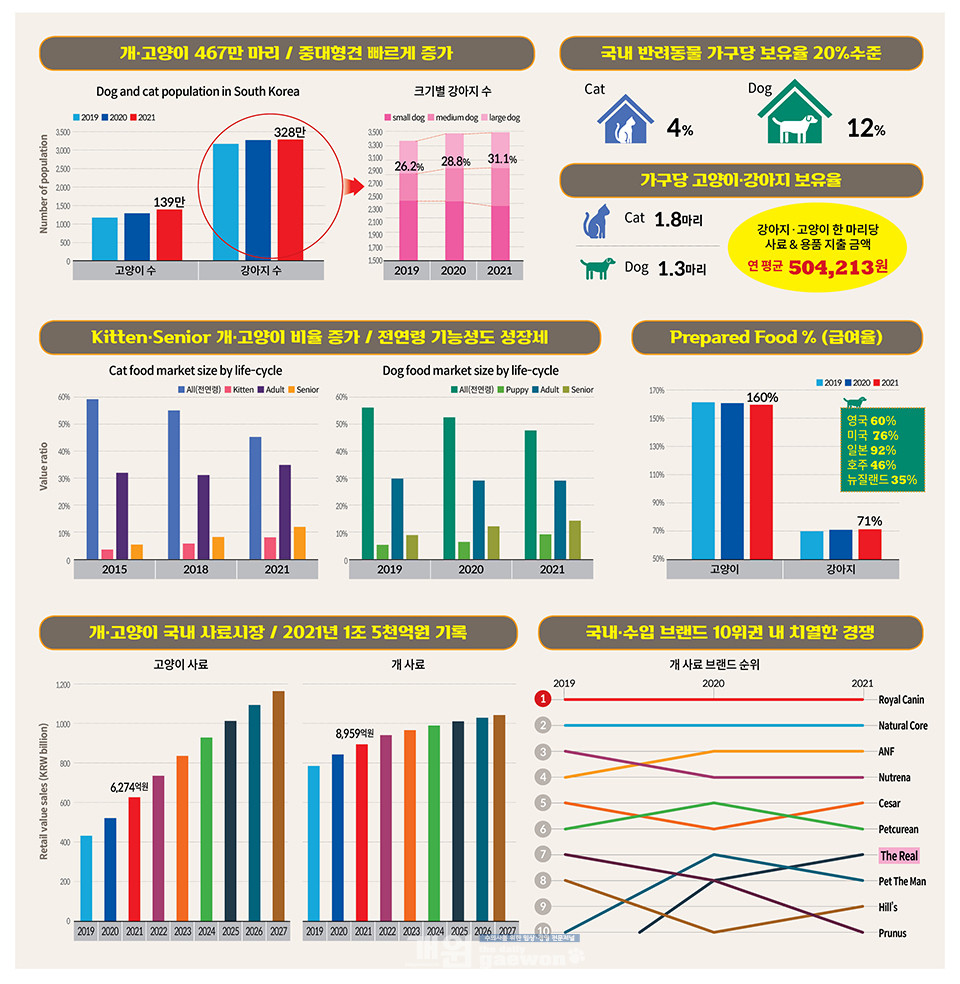 사료시장은 국산 51%, 수입 49%로 거의 차이가 없고, 수입 중저가 브랜드가 많아졌다. 펫푸드는 수입국보다는 가격과 퀄리티로 브랜드 가치를 매기는데, 수입도 국내에서 생산하는 경우가 많아 이제는 수입과 국산의 의미가 거의 없어졌다.