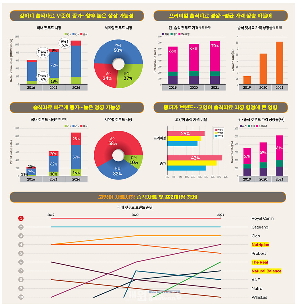또한 프리미엄 습식사료의 증가가 평균 가격 상승을 이끌며 빠르게 성장하고 있는 것으로 나타나 국내 습식사료 시장의 높은 성장 가능성이 전망되고 있다. 특히 중저가 브랜드가 고양이 습식사료 시장 형성에 지대한 영향을 미치는 것으로 나타났는데, 고양이 사료시장은 습식사료와 프리미엄 제품이 강세를 보이고 있다.