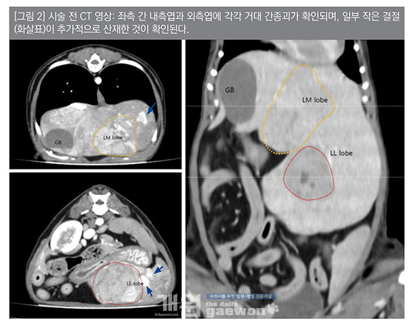 14살의 중성화 수컷 요크셔테리어 환자가 건강검진상 간수치 증가가 확인되었다. 복부초음파 및 CT 검사 결과,간 좌측 내측엽과 외측엽에 각각 거대 종괴가 확인 되었으며,그 외 작은 결절들도 추가적으로 확인되었다[그림 2]