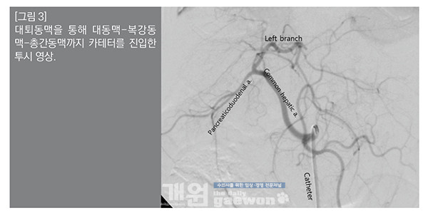 환자는 마취 후에 대퇴동맥을 통해 대동맥,복강 동맥, 총간동맥을 통해 종양으로 좌측 간엽 가지(left hepatic artery branch)로 접근하였다[그림 3]
