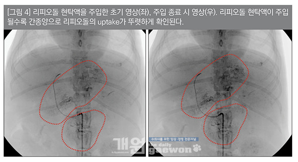 종양으로 feeding 하는 혈관을 선택하여 doxorubicin과 결합시킨 리피오돌 현탁액을 주입하였다.정상 간조직과 비교하여 간 종괴로 뚜렷한 리피오돌 흡수 (uptake)가 확인 되었으며,종양으로 들어가는 현탁액의 흐름이 느려질 때까지 주입하고 시술을 종료하였다[그림 4].