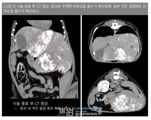 시술 후 CT 촬영을 통해 간 종괴로 뚜렷한 리피오돌 흡수를 다시 한번 확인하였다[그림 5]. 환자는 시술 직후 마취에서 회복하였으며, 시술 4시간 후 당일 퇴원하였다.시술 후 시술과 관련한 부작용은 확인되지 않았다.