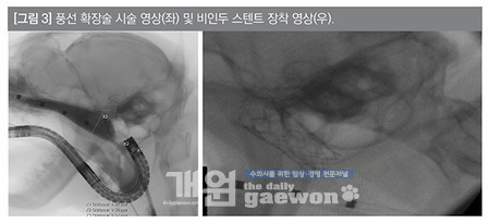 ‘풍선 확장술’은 좁아져 있는 협착부위를 풍선을 이용해 찢어서 확장시켜 주는 시술이다. High pressure PTA balloon을 주로 이용하게 되며, 투시 장비와 내시경 장비를 이용하여 손쉽게 좁아져 있는 부위를 확장시킬 수 있다[그림 3].