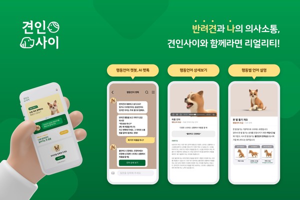 펫톡이 탑재된 반려견 전용 소통 앱 견인사이는 구글플레이, 애플 앱스토어 등 앱 마켓에서 무료로 다운로드할 수 있다.