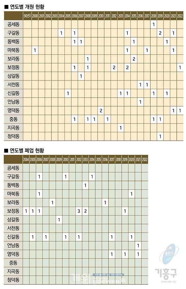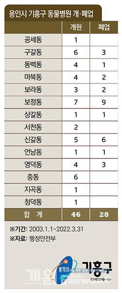 경기도 용인시 기흥구는 다른 지역보다 늦은 1998년부터 동물병원이 개원하기 시작해 2022년 3월 31일 기준 총 74개소가 개원, 이 중 28개소가 문을 닫고, 46개소가 개원 상태를 유지 중이다.