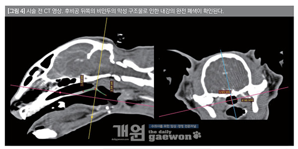 환자는 약 1년 6개월 전 구조된 유기묘로 구조 당시부터 지속적인 개구 호흡, 코고는 소리를 보였다고 한다. 식욕과 활력은 양호하였다. 의뢰병원에서 CT 검사를 통해 비인두 협착증으로 진단되었고, 별도의 내시경 검사는 의뢰병원에서 진행하지 않았다[그림 4].