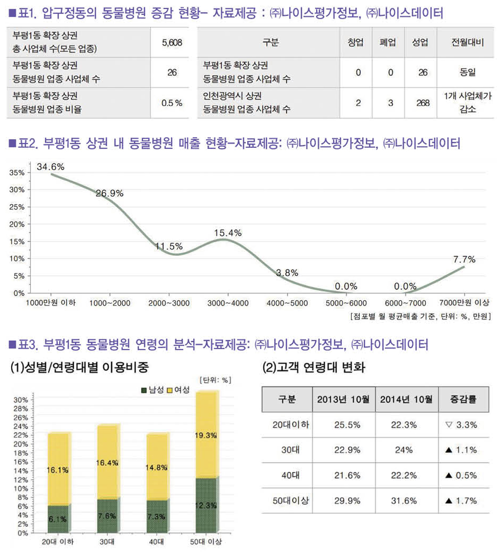 부평 1동에는 2014년 10월 기준(데이터의 집계가 2월씩 차이가 있음을 알아두자)으로 26개의 동물병원이 있다. 이는 전월과 동일한 수치이다. 일반적으로 전문직군은 창업과 폐업이 빈번하지 않지만, 인천광역시 전체로 보았을 때는 3개 동물병원이 문을 닫았고, 2개의 동물병원이 문을 열었다. 따라서 1개의 동물병원이 순 감소하였다.