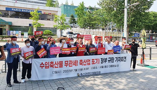 축산관련단체협의회(회장 이승호, 이하 축단협)는 지난 7월 11일 용산 전쟁기념관 앞에서 "수입축산물 무관세! 축산업 포기!"라는 제목의 기자회견문을 바탕으로 정부 규탄 기자회견을 개최했다.
