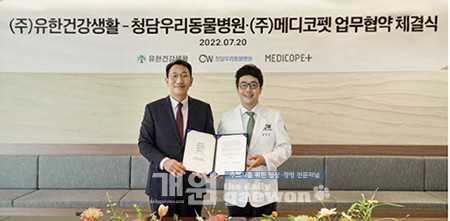 청담우리동물병원(원장 윤병국)과 ㈜메디코펫이 지난달 20일 유한건강생활과 반려동물을 위한 건강기능식품 개발을 위한 업무협약을 체결했다.
