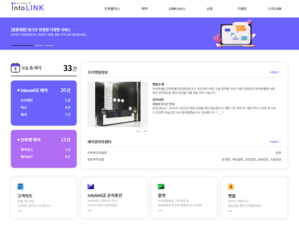 동물병원 전자차트 기업 IntoVetGE(인투벳GE)의 운영사 (주)인투씨엔에스가 전자차트와 인투펫 App 예약서비스가 연동되는 통합 웹 서비스인 인투링크(www.intolink.co.kr)를 출시했다.