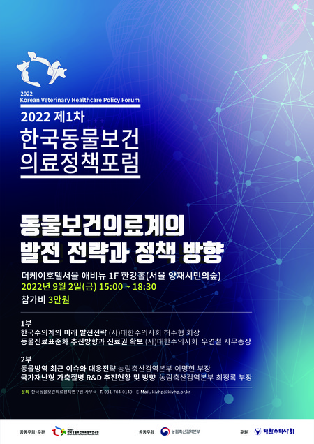 한국동물보건의료정책연구원(원장 김재홍)과 농림축산검역본부(본부장 박봉균)가 공동 개최하는 ‘제1차 한국동물보건의료정책포럼’이 9월 2일(금) 더케이호텔서울 한강홀에서 열린다.