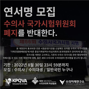 이번 수의국시위 폐지 반대 연서명을 주도한 대한공중방역수의사협회(회장 조영광), 대한수의과대학학생협회(회장 이진환), 수의미래연구소(공동대표 조영광·허승훈)는 연서명 결과 및 반대 의견서를 농식품부에 전달할 계획이다.