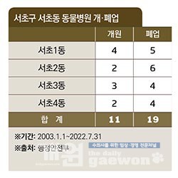 행정안전부 최신 데이터에 따르면, 서초구 서초동은 1998년부터 동물병원이 개원하기 시작해 2022년 7월 31일까지 총 30개소가 개원, 이 중 19개소(63%)가 문을 닫고, 11개소(37%)가 개원을 유지하고 있다.