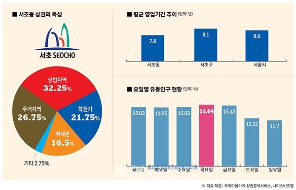 서초역 인근은 학원가 위주의 상권으로 강남 스카이에듀, 종로학원 등 유명 학원이 많이 자리해 있다. 이에 소비력이 높은 40~50대 학부모와 학생들을 대상으로 한 카페, 서점의 매출이 높게 나타난다. 법조타운 일대는 고소득 40대 직장인이 많아 의료와 미용·건강 등 서비스 업종이 호황을 누리고 있다.