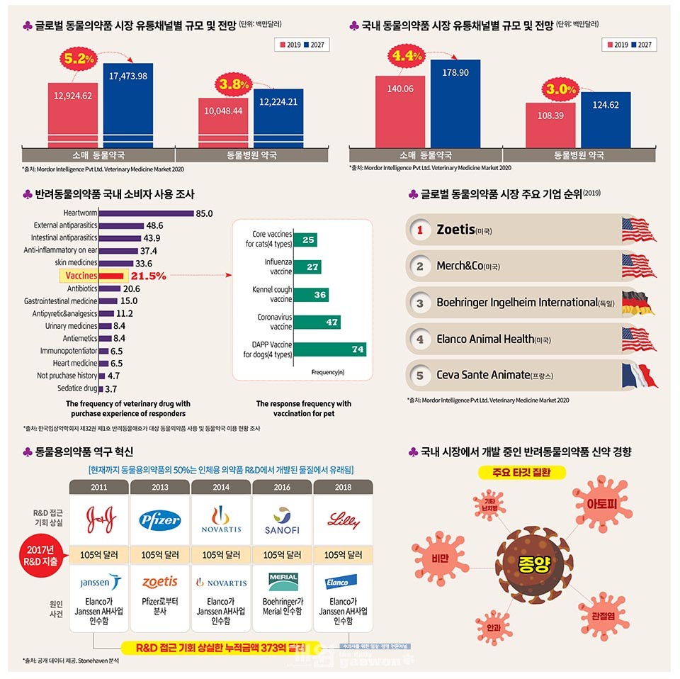 국내는 소매 동물약국이 140백만 달러에서 178백만 달러, 동물병원이 108백만 달러에서 124백만 달러로 3.0% 증가할 것으로 예측했다. 국내 반려동물의약품 소비 1위는 ‘하트웜’이 85%로 가장 많이 차지했으며, 백신의 경우 개 DAPP 백신을 가장 많이 사용했다.