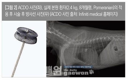 그 중에서 ACDO는 수의 전용으로 개발된 우산 모양의 이식물로 ductus에 삽입하여 동맥관을 폐색시키는 역할을 한다. ACDO 장착법은 2000년대 후반에 소개된 후로 현재까지 전세계적으로 널리 사용되고 있는 인터벤션 치료법으로 국내에서도 여러 동물병원에서 시술을 하고 있다[그림 2].