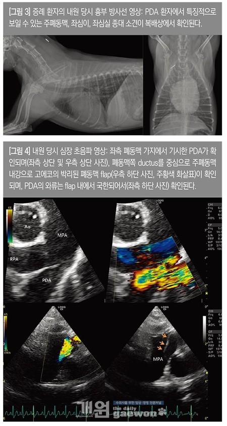 내원 당시 신체검사상, 심잡음(continuous murmur)이 청진되었고, 폐음은 양호하였다. 흉부 방사선 검사에서 주폐동맥, 좌심방, 좌심이 종대가 확인되었으며, 후엽 폐혈관의 울혈 소견이 동반되어 있었다. 심장 초음파 검사 상 좌측 폐동맥 가지 부근에서 continuous flow를 보이는 PDA가 확인되었으며, 수축기와 이완기 압력경사는 각각 104mmHg, 33.9mmHg로 측정되었다. B-mode에서 확인된 PDA의 형태는 type IIa 형태로 ductus의 직경은 2.2~2.4mm 가량으로 측정되었다.