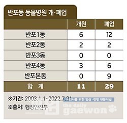 다만 유동인구가 많은 만큼 오랜 기간 자리 잡은 수의사가 아닌 이상 반포동에서 살아남기란 쉽지 않아 보인다. 반포동에서 개원보다 폐업한 동물병원이 많은 것이 그 방증이다.
