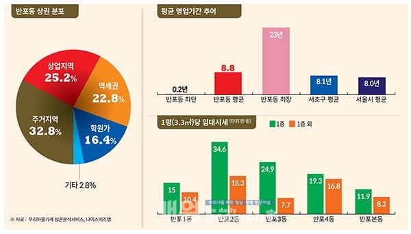 반포2·4동의 1평당 건물 평균 임대료는 각각 24만 3천 원, 16만 9천 원으로 비교적 젊은 세대들이 많이 거주하고 있다.