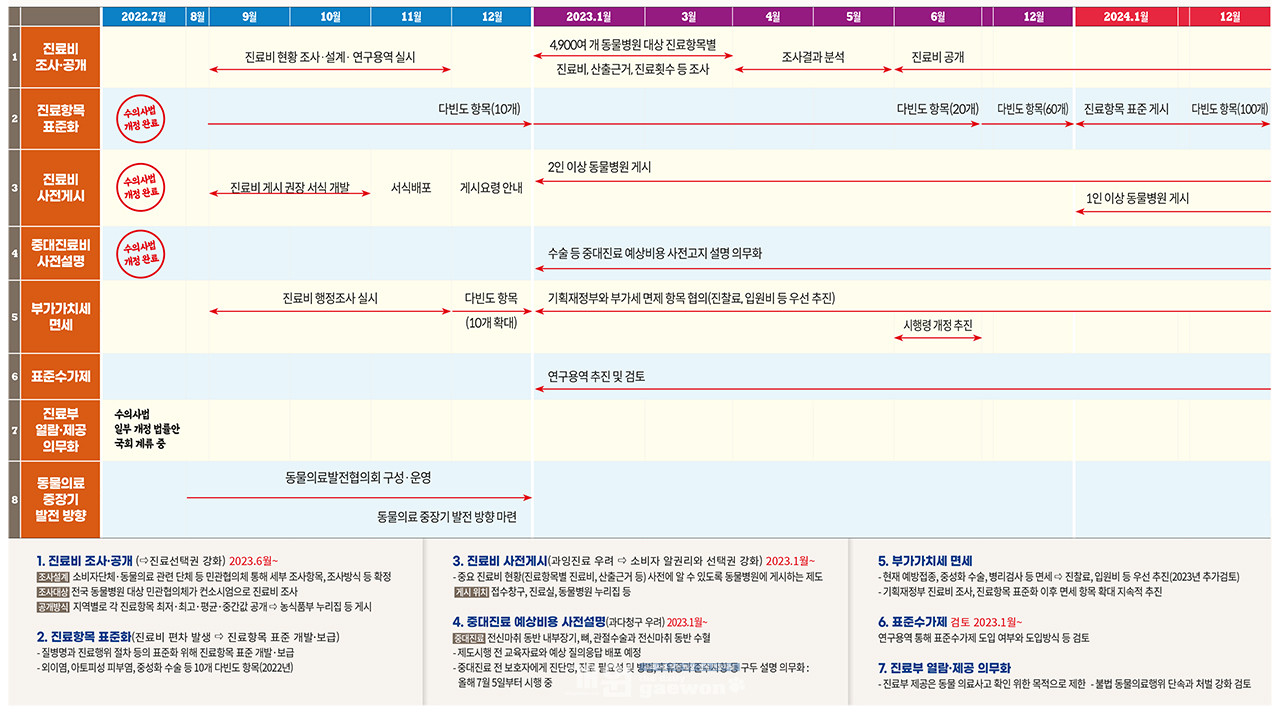 농림축산식품부가 최근 ‘반려동물 진료분야 주요 정책’ 추진 계획을 발표, △진료비 조사·공개 △진료항목 표준화 △진료비 사전게시 △중대진료 사전설명 △부가가치세 면세 △표준수가제△진료부 제공 등 7개 주요 정책에 대한 로드맵을 발표했다.