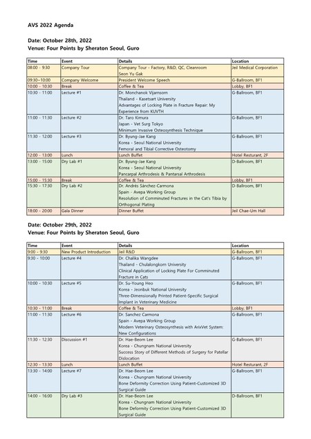 29일 오전에는 태국의 Chalika Wangdee(쭐랑롱꼰대) 교수가 ‘고양이 분쇄골절 시 플레이트 활용’을, 허수영 (전북대) 교수가 ‘3D 임플란트를 통한 환자 맞춤형 수술’를, Dr. Sanchez Carmona가 ‘Arix Vet System을 이용한 현대 수의학적 골합성’ 이론 강의를 진행한다. 이후 이해범 교수의 다양한 슬개골 탈구 수술 방법의 성공 사례’를 주제로 한 토론 시간도 있을 예정이다.