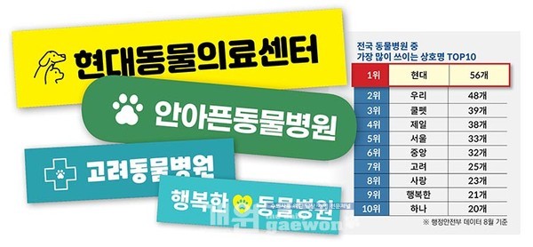 본지가 행정안전부 최신 데이터에 올해 8월 기준 집계된 5천여 개에 달하는 전국 동물병원들의 상호명 현황을 분석한 결과, 시대별로 선호하는 상호명이 다른 것으로 조사됐다.