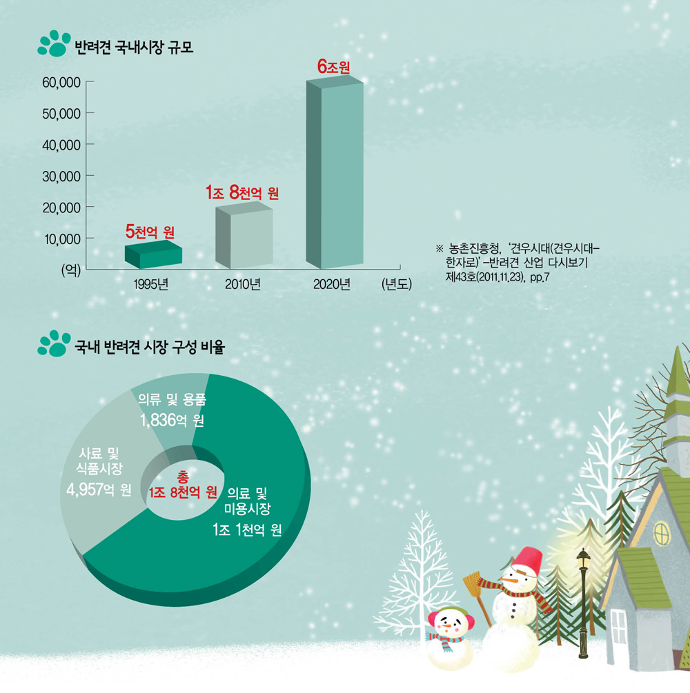 한국소비자원이 2013년 발표한 반려동물 시장 현황에 따르면, 반려견 관련 국내시장 규모는 1995년 5,000억 원에서 2010년 1조 8,000억 원으로 성장했고, 2020년에는 6조원 규모로 증가할 것으로 전망되고 있다. 관련 시장(1.8조원) 중 의료 및 미용시장이 1.1조원을 차지하고, 사료 및 식품시장 4,957억 원, 의류 및 용품 1,836억 원 등으로 추정된다.