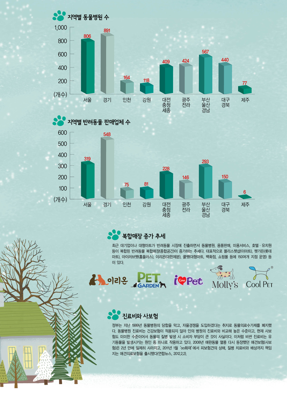 개, 고양이 등 가정에서 반려 목적으로 기르는 동물의 판매업체 수는 전국적으로 1,850개에 달하고, 전국의 동물병원 수는 3,896개에 이르는 것으로 조사됐다(농림축산검역본부 동물보호관리시스템).