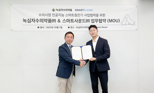 녹십자수의약품(주)(대표 나승식)이 지난 10월 7일 스마트사운드㈜(대표 이정호)와 동물용 무선 스마트청진기 ‘위더펫(WithaPET)’의 반려동물 헬스케어 시장 확대를 위한 협약식을 진행했다.