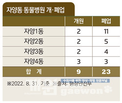 행정안전부 최신 데이터에 따르면, 광진구 자양동은 1995년부터 동물병원이 개원하기 시작해 2022년 8월 31일까지 총 32개소가 개원, 이 중 23개소(72%)가 문을 닫고, 9개소(28%)가 개원을 유지하고 있다.