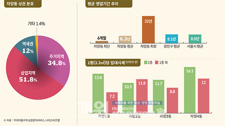 건대입구역을 끼고 있는 자양4동은 1평(3.3㎡)당 14만 1천 원 수준으로 자양동 내에서 임대료가 가장 비싼 지역이다. 강남 3구 중 한 곳인 서초구 평균보다도 높다.