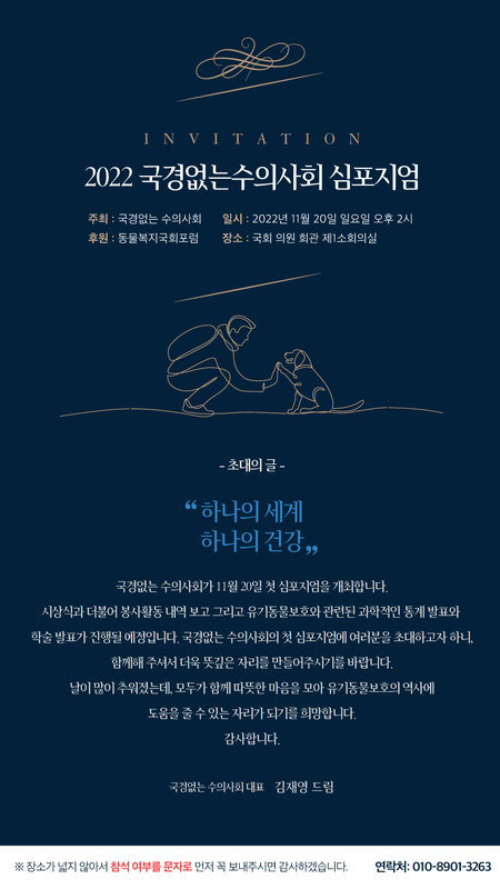 ‘2022 국경없는 수의사회 심포지엄’은 유기동물 보호에 관심 있는 사람 누구나 참여할 수 있으며, 참석 여부를 문자(010-8901-3263)로 보내면 된다.