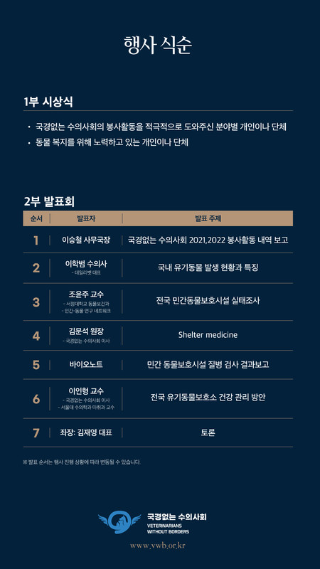 2부 발표회에서는 이승철(국경없는 수의사회) 사무국장의 ‘국경없는 수의사회 2021, 2022 봉사활동 내역 보고’를 시작으로 이학범(데일리벳) 대표가 ‘국내 유기동물 발생 현황과 특징’을, 김문석(국경없는 수의사회) 이사가 ‘Shelter medicine’을, 이인형(서울대) 교수가 ‘전국 유기동물보호소 건강 관리 방안’을 차례로 소개한다. 마지막 순서로는 김재영(국경없는 수의사회) 대표를 좌장으로 한 토론회도 마련돼 있다.
