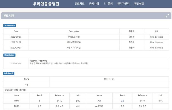 또한 사이트 내부에서는 병원 간 1대1문의가 가능한 만큼 자료를 공유하면 2차 동물병원은 의뢰 진료가 끝나고 별도의 결과 보고서를 작성할 필요가 없어진다.