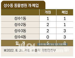 행정안전부 최신 데이터에 따르면, 성동구 성수동은 2003년부터 동물병원이 개원하기 시작해 2022년 8월 31일까지 총 13개소가 개원, 이 중 8개소(62%)가 문을 닫고, 5개소(38%)가 개원을 유지하고 있다.