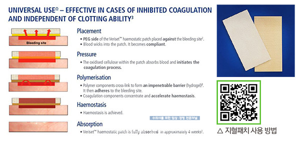 ‘Veriset’의 PEG면을 출혈 부위에 닿게끔 부착 시 혈액이 스며든 패치는 안정적으로 안착하고, 패치 안의 Oxidized regenerate cellulose는 혈액을 흡수해 혈액의 pH를 낮춰 coagulation을 진행한다. 이후 고분자 성분이 교차결합해 hydrogel 장벽을 형성하고, 출혈 부위에 밀착하면 hold까지 30초의 시간이 소요된다.