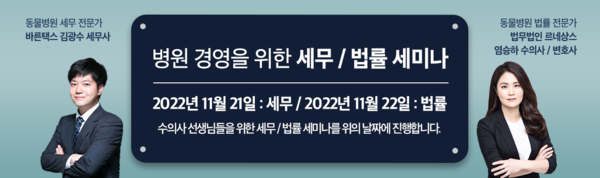 11월 21일에는 동물병원 전문 세무사이자 본지 세무 칼럼 기고자인 김광수(바른택스) 대표 세무사가 연자로 나서 ‘연말, 동물병원이 놓치지 말아야 하는 세무 및 노무’를 주제로 동물병원 경영을 위한 세무 강의를 진행한다.