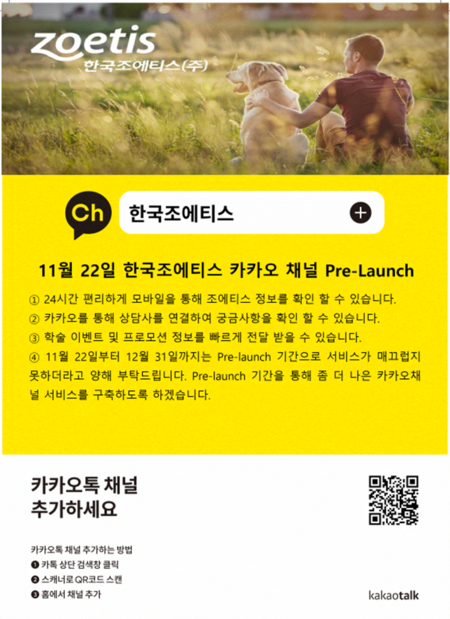 한편 이번 파일럿 론칭은 12월 31일(일)까지 운영될 예정이며, 채널 추가 방법은 이미지를 참조하면 된다. 카카오톡 채널 추가 관련 문의는 메일(zoetisforyou@zoetis.com)로 하면 된다.
