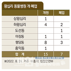 행정안전부 최신 데이터에 따르면, 성동구 왕십리(상왕십리동, 하왕십리동, 홍익동, 도선동, 마장동, 행당동, 사근동)는 2003년부터 동물병원이 개원하기 시작해 2022년 8월 31일까지 총 22개소가 개원, 이 중 7개소(32%)가 문을 닫고, 15개소(68%)가 개원을 유지하고 있다.