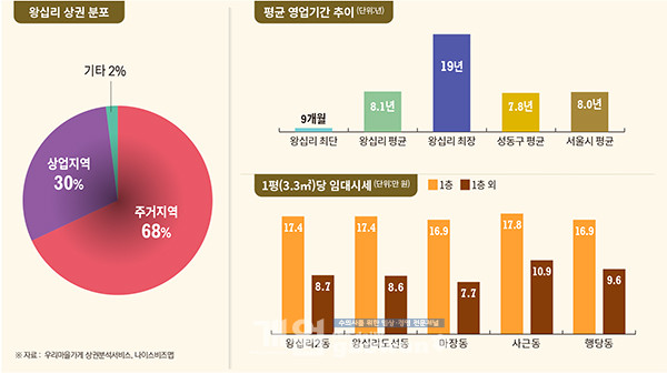 왕십리 뉴타운 구역에 속하는 상왕십리동, 하왕십리동, 홍익동, 도선동의 경우 1평(3.3㎡)당 건물 평균 임대료는 13만 원 수준이다. 마장동은 12만 3천원, 행당동 13만 3천원, 사근동 14만 4천원 수준이다.