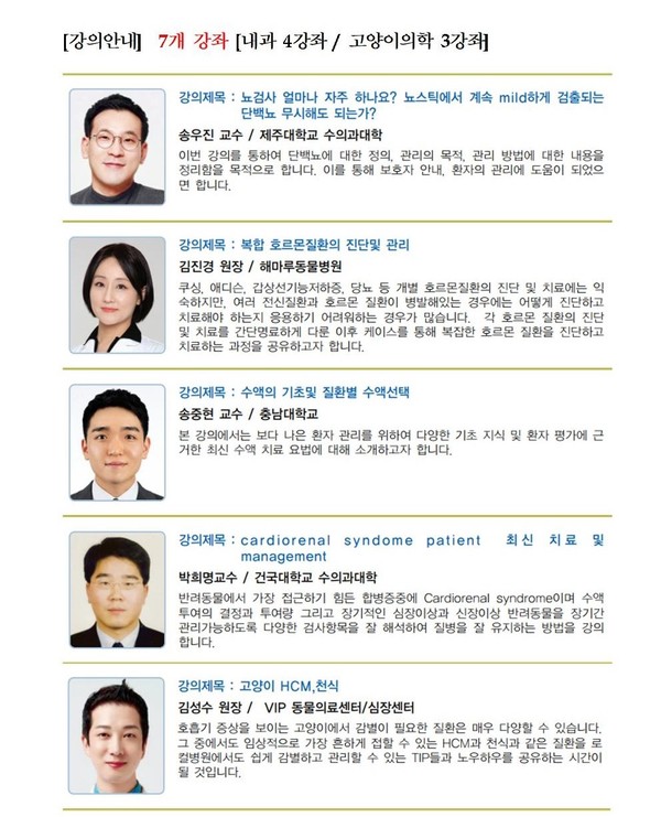 이번 연수교육은 ‘내과’ 주제 4강과 ‘고양이의학’ 주제 3강, 총 7강으로 구성됐으며, 모든 강의는 2시간씩 진행된다.