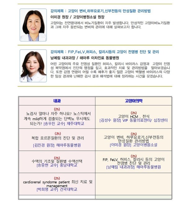 고양이 강의는 김성수(VIP동물의료센터) 원장이 ‘고양이 HCM, 천식’을, 이미경(고양이병원소설) 원장이 ‘고양이 변비, 하부요로기, 신부전 등의 만성질환 관리 방법’을 제시하고, 남예림(해마루이차진료동물병원) 내과과장이 ‘FIP, FeLV, 허피스, 칼리시 등의 고양이 전염병 진단 및 관리’를 소개한다.