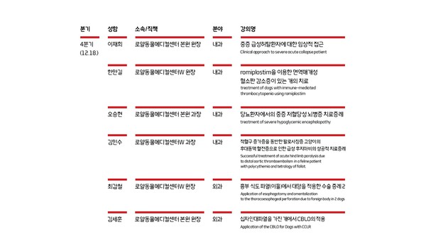 앞서 로얄동물메디컬센터는 10월 열린 3분기 정기 증례발표회에서 400명에 육박하는 신청자를 기록하며 성황리에 마친 바 있다.