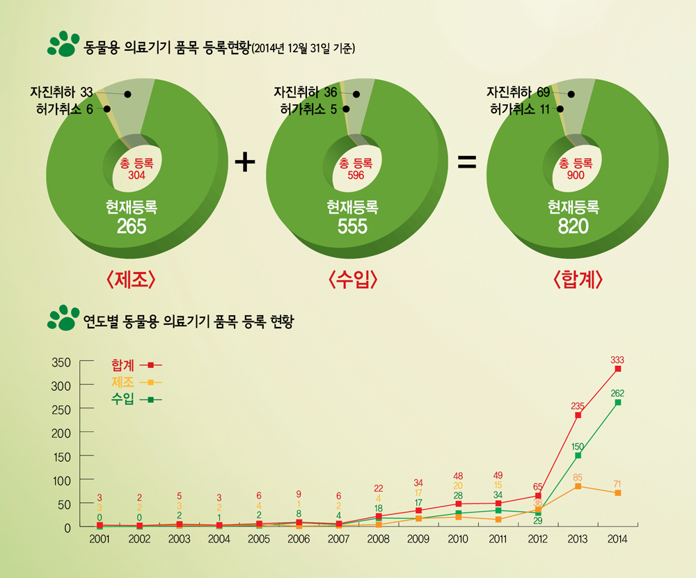 농림축산검역본부 동물약품관리과 의료기기계 문진산 수의연구관이 발표한 ‘동물용 의료기기 인?허가 및 관리제도’에서 동물용 의료기기 품목 등록 현황(2014년 12월 31일 기준)을 살펴보면, 제조는 총 등록 304건 중 허가취소가 6건, 자진취하가 33건으로 현재 등록은 265건으로 조사됐다. 수입은 총 등록 596건 중 허가취소 5건, 자진취하 36건으로 현재 555건이 등록된 것으로 나타났다. 동물용 의료기기 품목의 제조와 수입 등록현황을 합치면 총 등록은 900개로 허가취소 11건, 자진취하 69건으로 현재 등록은 820건으로 조사됐다.