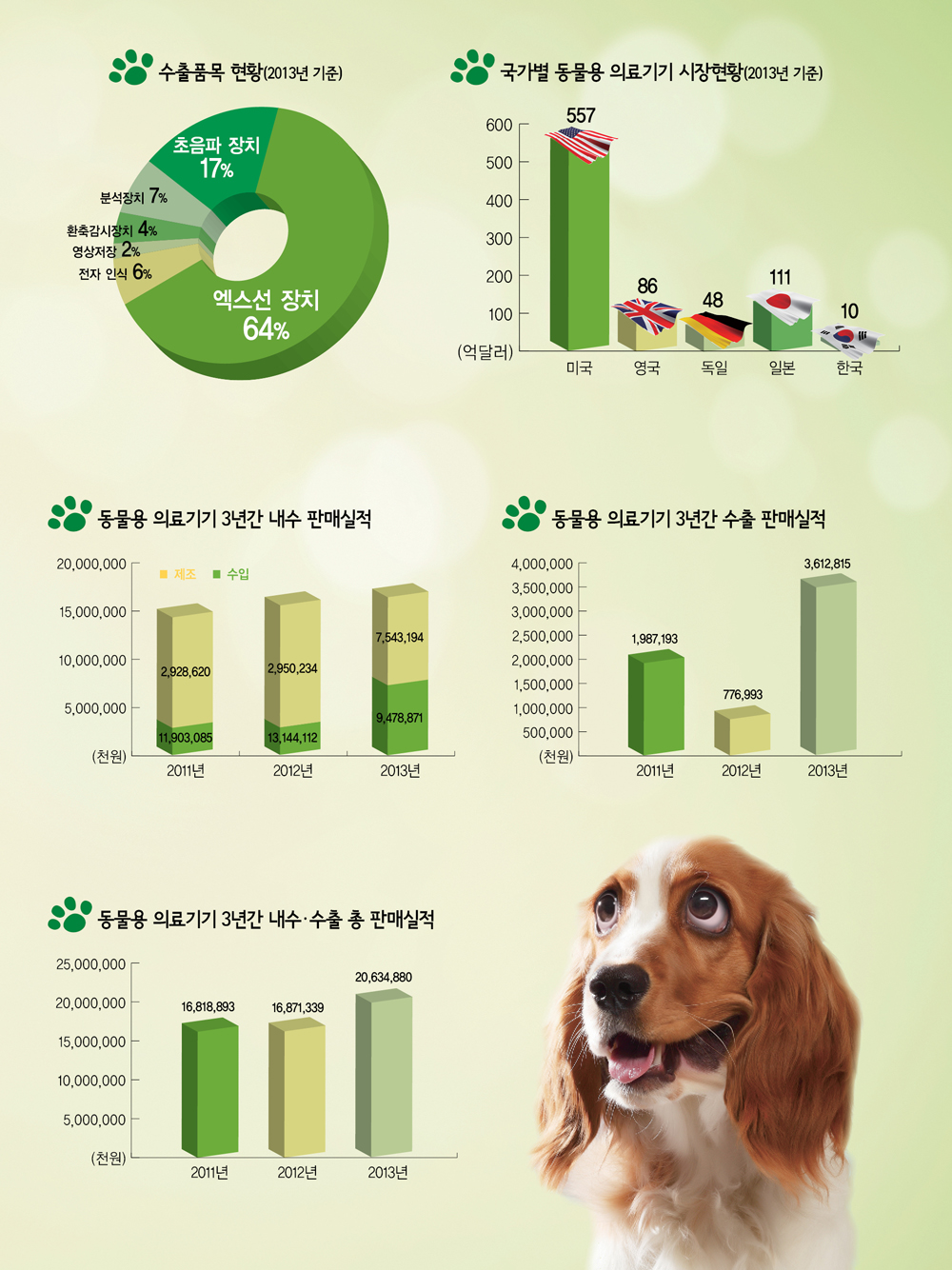 또한 동물용 의료기기의 수출 품목 현황(2013년 기준)을 살펴보면, 엑스선 장치가 64%로 가장 많았으며, 이어 초음파 장치(17%), 분석장치(7%), 전자 인식(6%), 환축감시 장치(4%), 영상저장(2%) 순으로 나타났다. 국가별 동물용 의료기기 시장현황을 살펴보면, 2013년 기준 미국이 557억 달러 규모로 1위를 차지했으며, 이어 일본이 111억 달러, 영국 86억 달러, 독일 48억 달러, 한국이 10억 달러를 기록했다. 동물용 의료기기의 최근 3년간 판매실적 현황을 보면, 2013년 내수시장은 수입이 94억 여만 원으로 전년대비 27.9% 마이너스 성장했으며, 제조는 75억 여만 원으로 전년대비 155.7%나 성장했다. 제조와 수입을 합한 내수시장은 총 170억 여만 원으로 전년대비 5.8% 성장한 것으로 나타났다.
