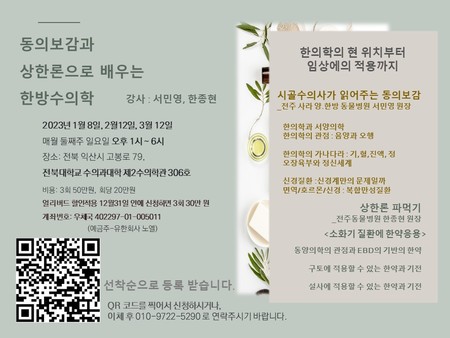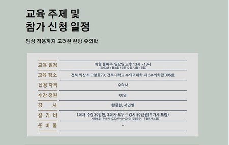 한의학의 현 위치부터 임상 적용까지 다룰 이번 세미나는 내년 1월부터 3월 둘째 주 일요일인 1월 8일, 2월 12일, 3월 12일 총 3회차에 걸쳐 전북 익산시 전북대 수의과대학 제2수의학관 306호에서 오후 1시부터 6시까지 진행된다.