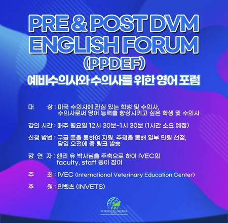 Dr. 헨리유가 ‘예비 수의사와 수의사를 위한 영어 포럼(PPDEF)’을 오는 12월 19일(월)부터 매주 월요일 12시 30분부터 1시간 동안 인벳츠(invets.net)에서 진행한다.