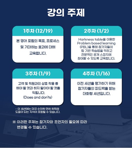 강의 내용은 △본 영어 포럼의 목표, 프로세스 및 기대하는 효과(12월 19일) △Harkness table을 이용한 Problem based learning(PBL)을 통해 팀 기반 학습법과 전문적인 공개 스피치 참여법 교육(1월 2일) △고객 및 직원과의 상호 작용 중 해야 할 것과 하지 말아야 할 것 익히기(1월 9일) △이전 세션 평가를 위한 참가자들의 피드백(1월 16일) 순으로 진행된다.